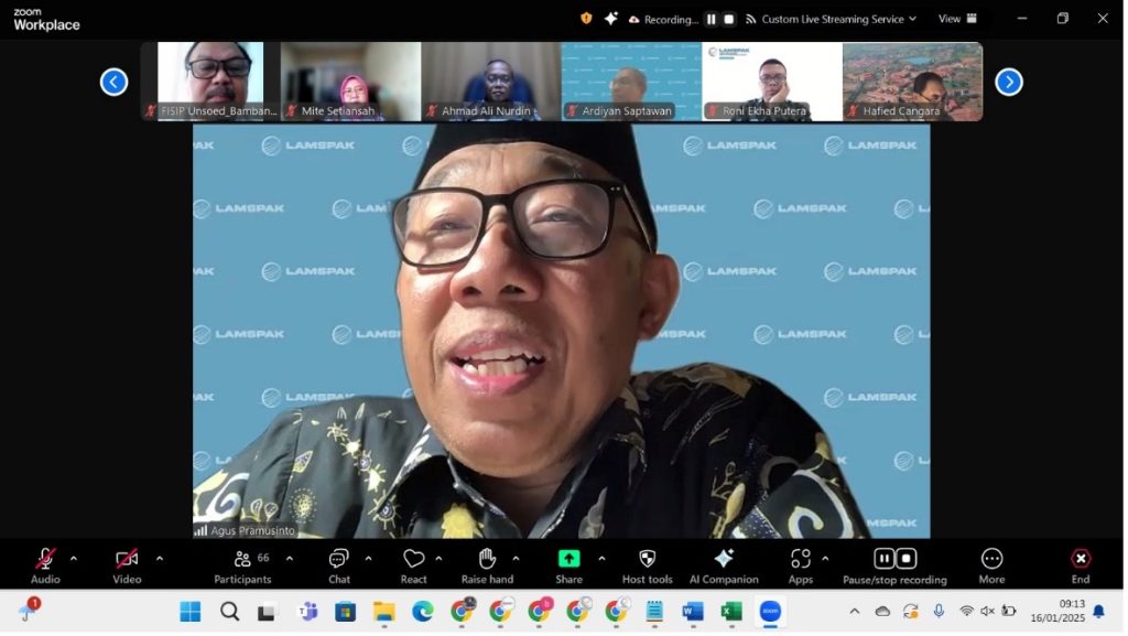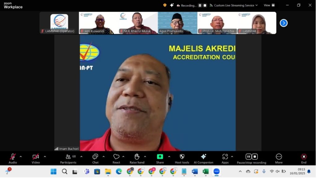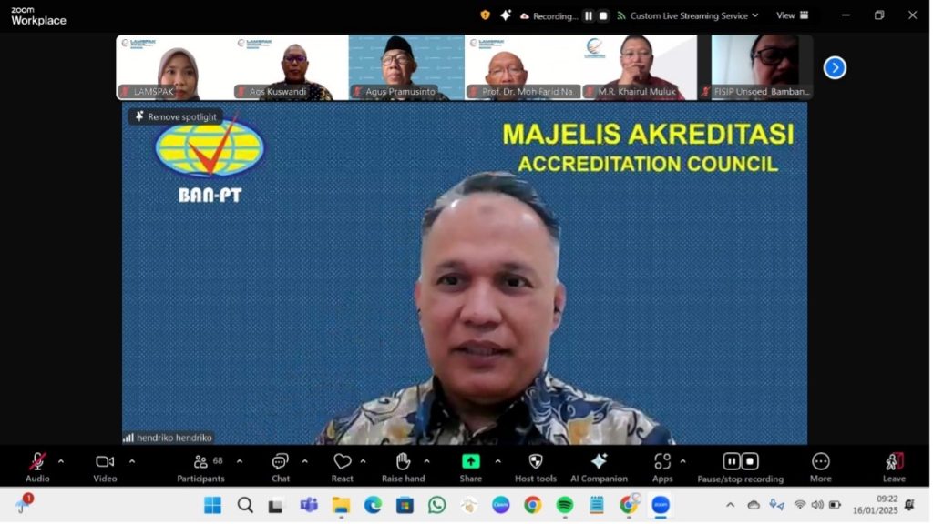 LAMSPAK memberikan pembekalan tentang instrumen APS (Akerditasi Progran Studi) secara daring pada Kamis, 16 Januari 2025. Ketua Majelis Akreditasi (MA) LAMSPAK, Prof. Dr. Agus Pramusinto, MDA. memberi sambutan sekaligus membuka acara pembekalan.